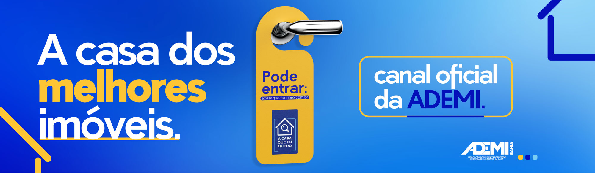 Este é o canal oficial de venda de imóveis da Ademi-BA, um portal com as melhores oportunidades do mercado imobiliário da Bahia, todos empreendimentos de empresas filiadas à associação. Pode confiar!