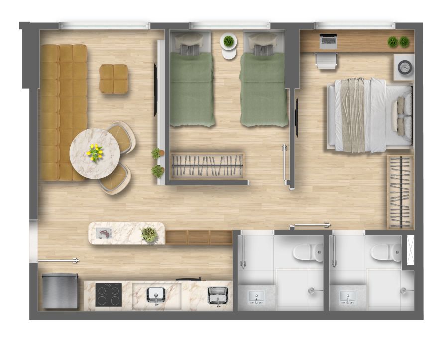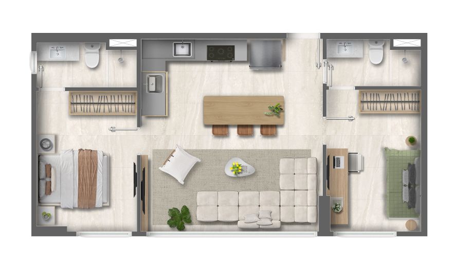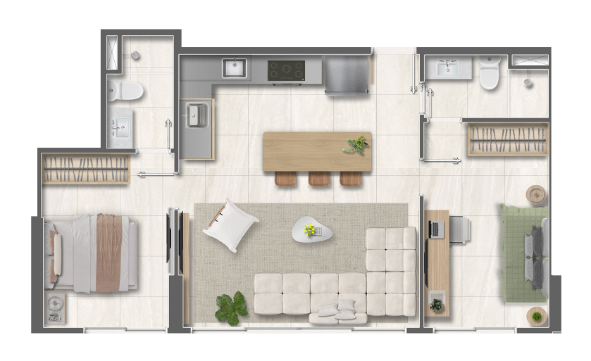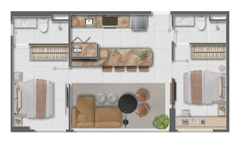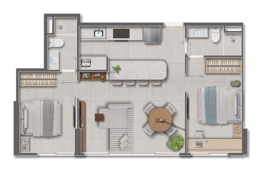 Com plantas inteligentes de 46m² a 59m² (2 quartos com opções de até 2 suítes), o foco é a versatilidade absoluta. O condomínio expande os limites do lar com lazer completo — piscina, academia, quadra e brinquedoteca — e conveniências modernas como coworking, lavanderia e pet place. Design contemporâneo e funcionalidade em um endereço de alta valorização e liquidez.