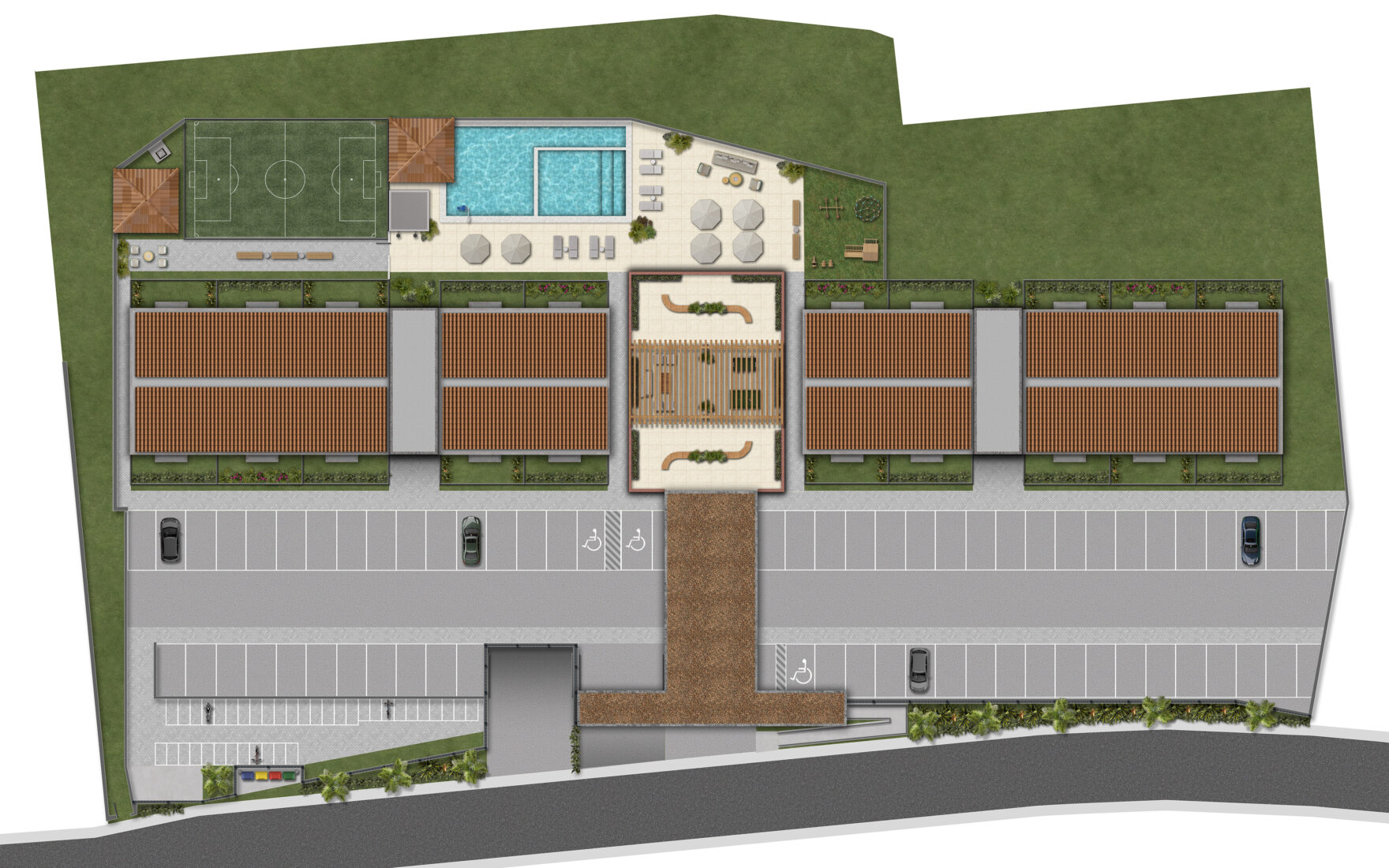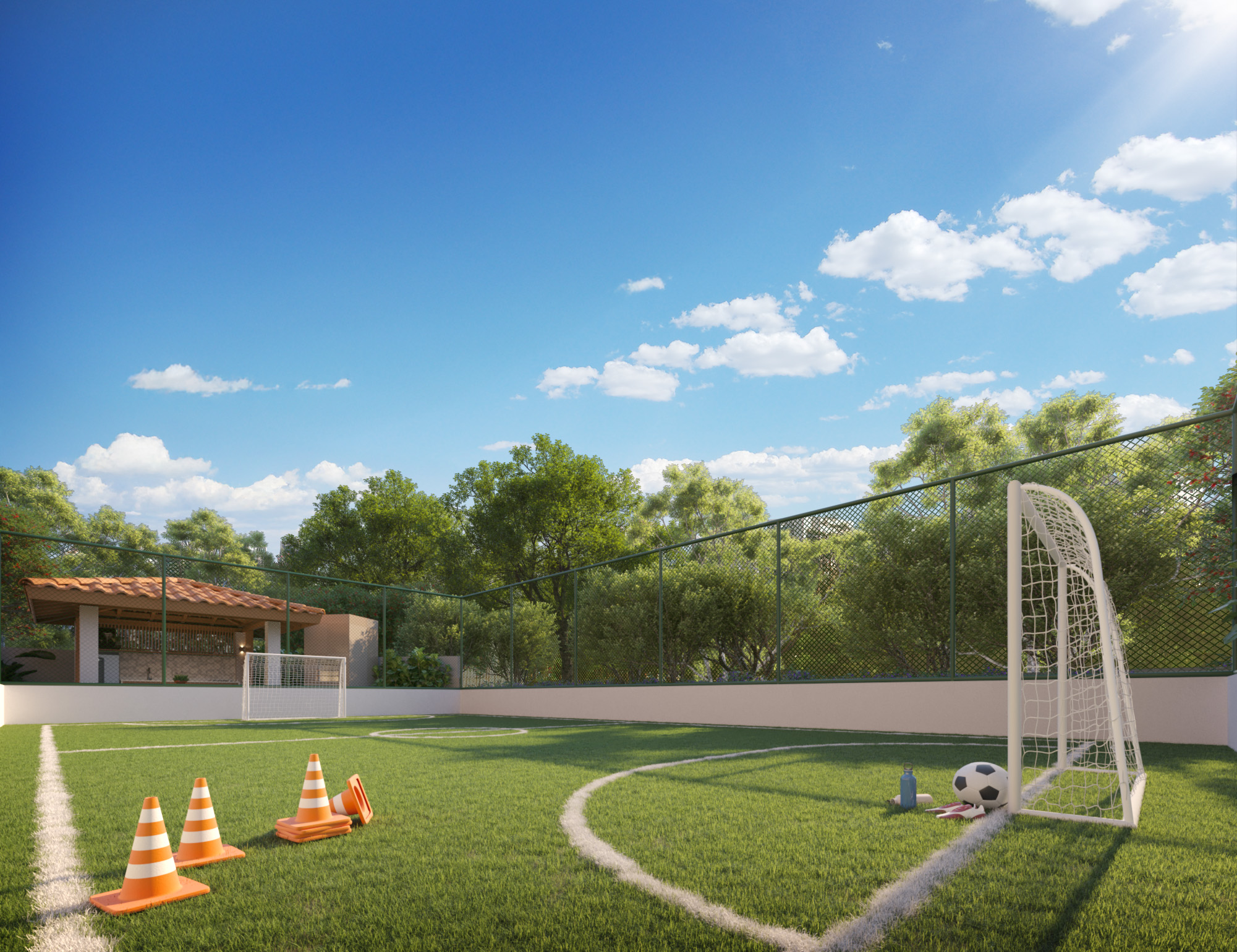 Piscina, deck solário, parque infantil, espaço gourmet, campo gramado
