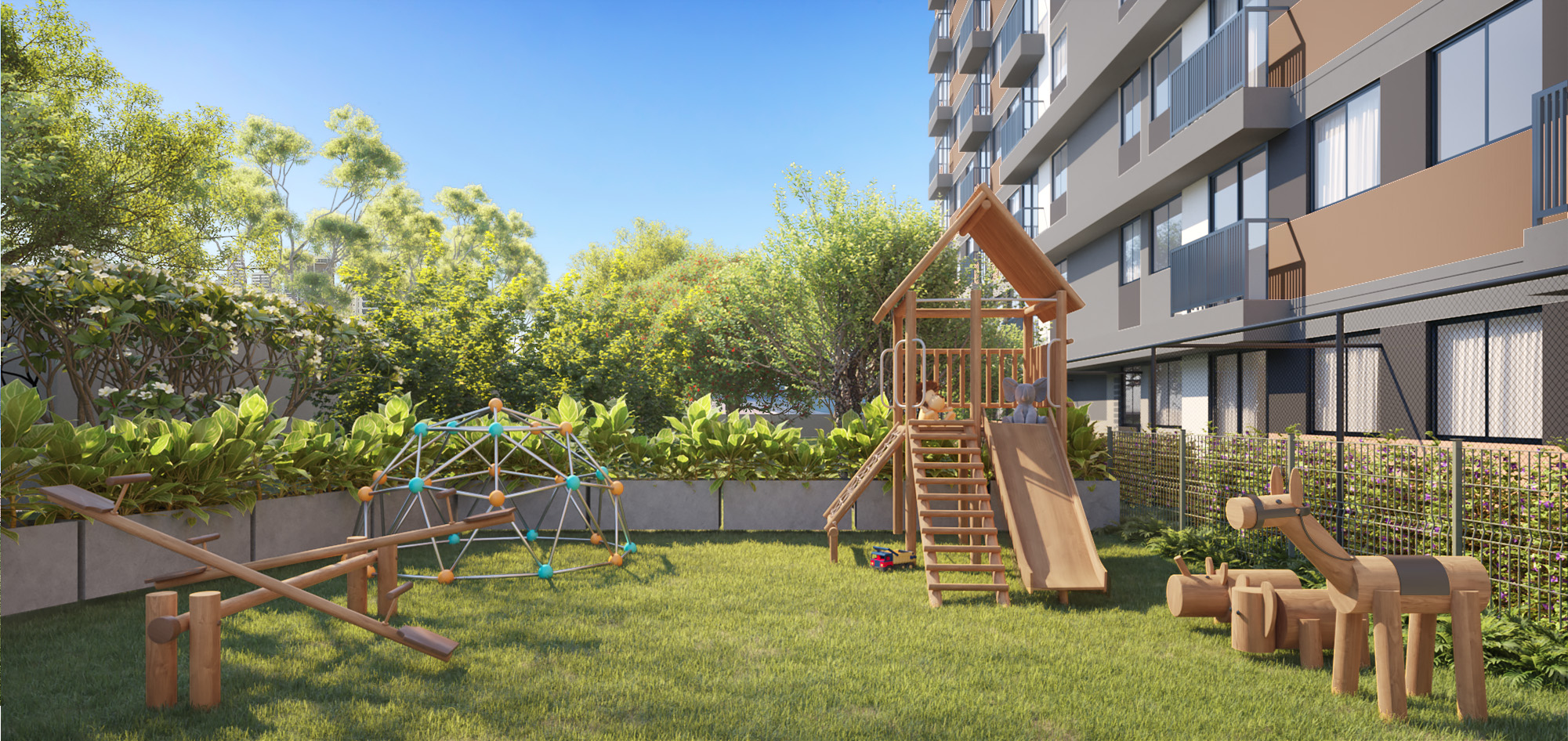 O condomínio conta com área de lazer completa, com piscinas, campo gramado, espaços kids, academia e muito mais.
