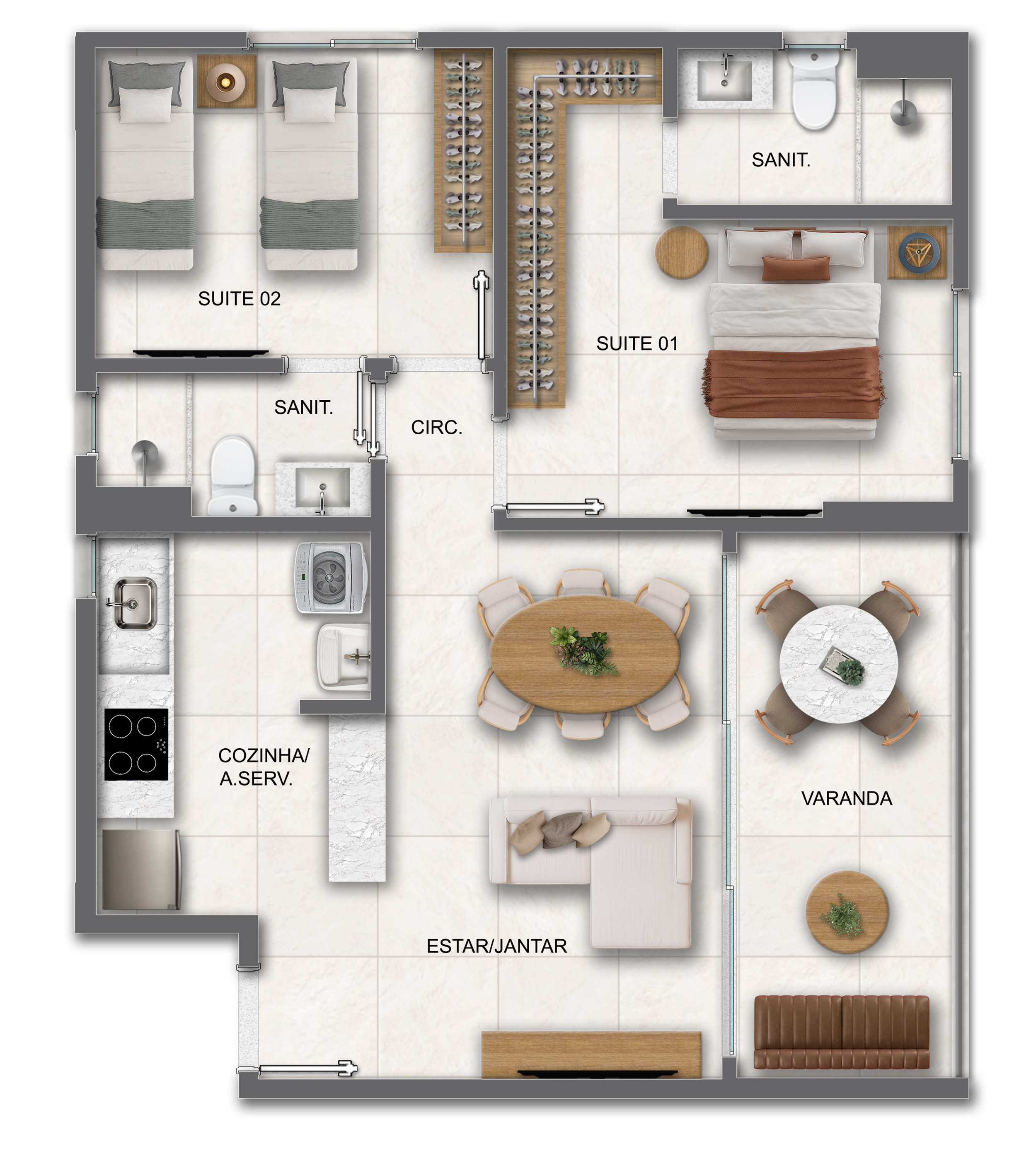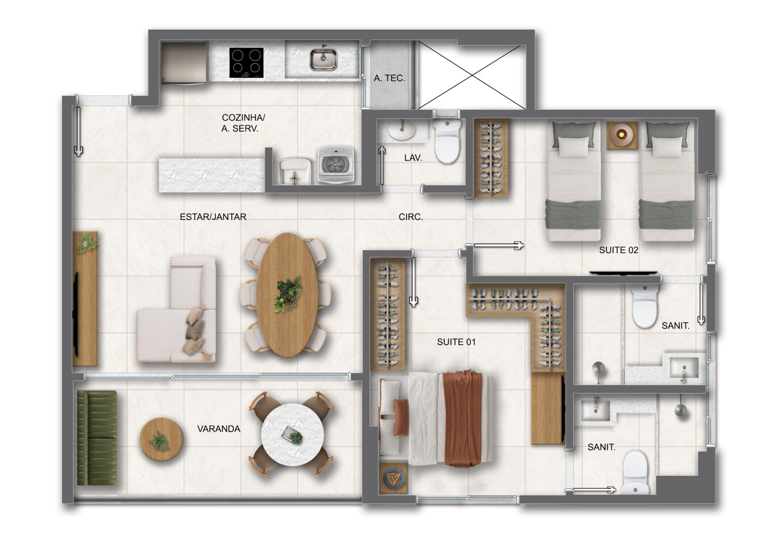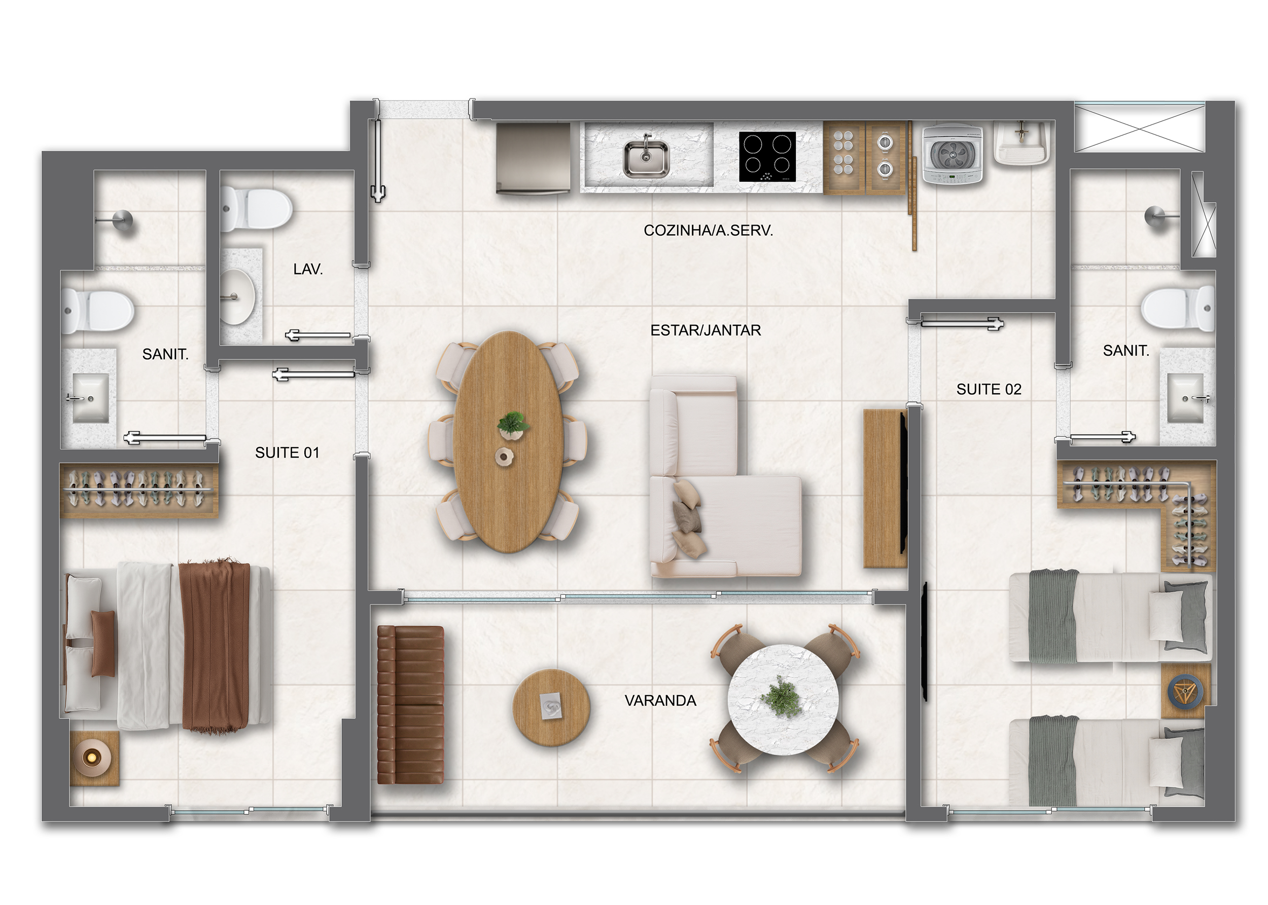 Apartamentos de 2 suítes, varanda, lavabo e plantas inteligentes entre 65 m² e 70 m², o projeto foi pensado para oferecer praticidade e conforto no dia a dia.