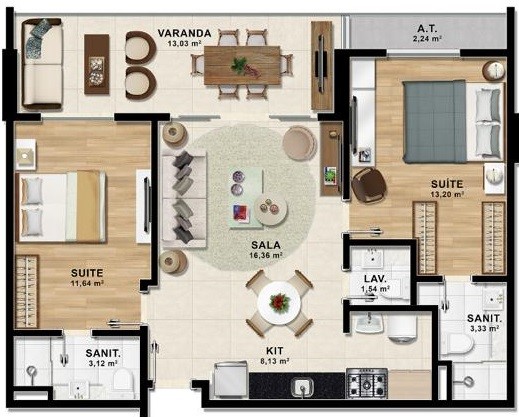 - Opção de Planta 3/4 com 81,14m² com suíte, varanda e 2 vagas de garagem;
