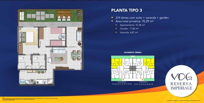 O VOG Reserva Imperiale tem tudo para ser um sucesso de vendas, na melhor localização de Abrantes, condomínio com infraestrutura de lazer completa, segurança, opções de plantas de 2/4 com suíte, garden, varanda e pátio; e conta ainda com financiamento pela Caixa.